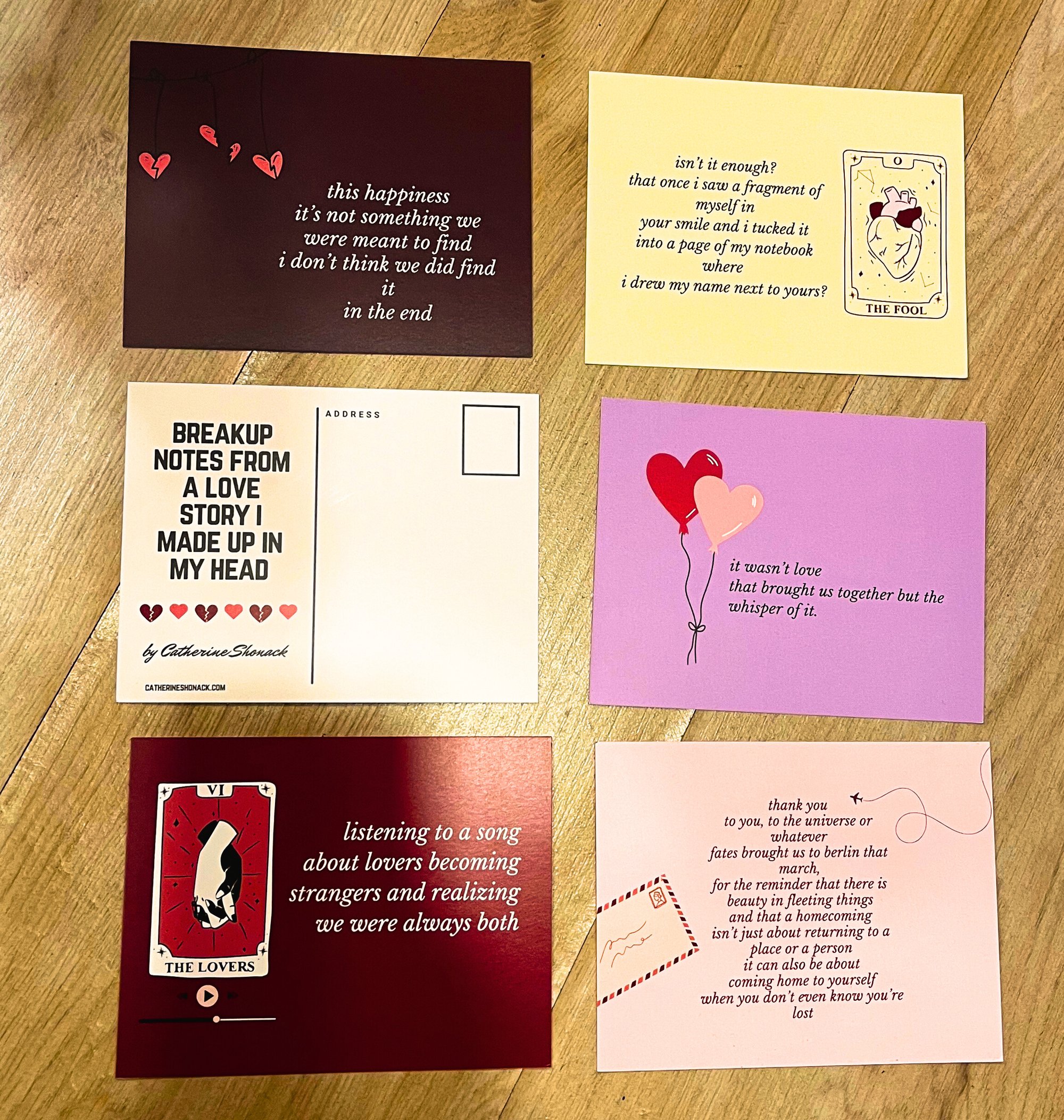 Set of five postcards featuring quotes from "breakup notes from a love story i made up in my head". They all have the same back (middle left postcard).